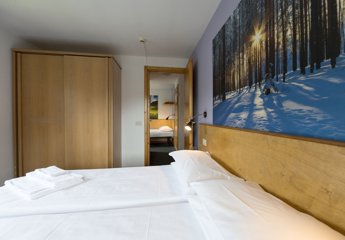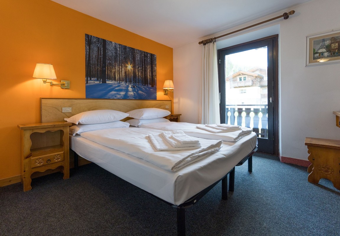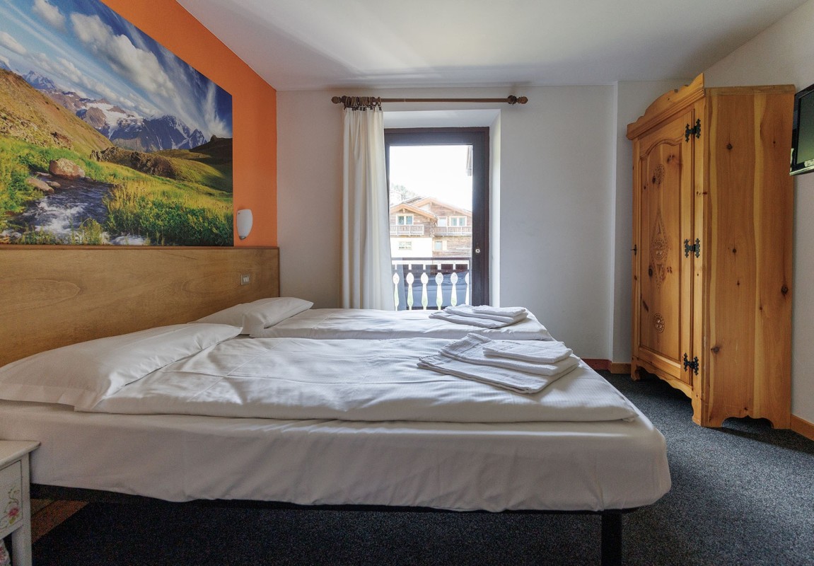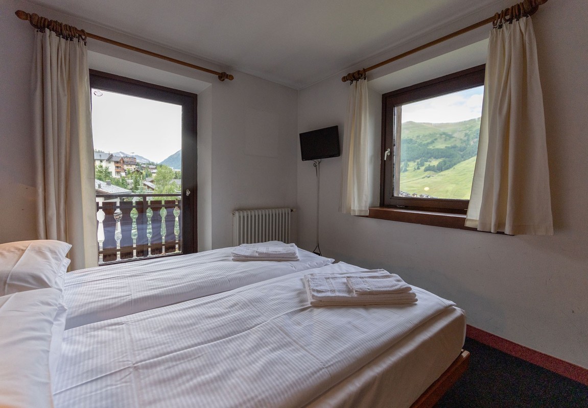 La nostra sistemazione più spaziosa, ideale per famiglie o gruppi di amici. La Camera Quadrupla è composta da due camere comunicanti, una soluzione che garantisce a tutti comfort e privacy. La dotazione include due bagni, due balconi e due TV satellitari. L'arredamento richiama lo stile degli anni '70, ma la praticità della sistemazione e la convenienza del prezzo ne fanno un'opzione eccellente. Spaziosa e pulita, rappresenta il miglior compromesso per gruppi attenti al budget che desiderano soggiornare a Livigno.
