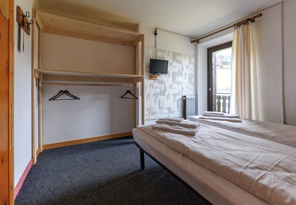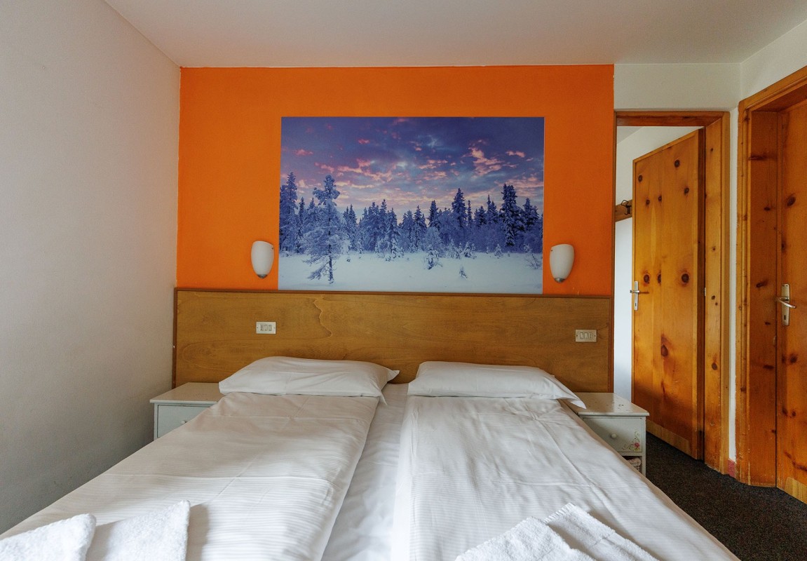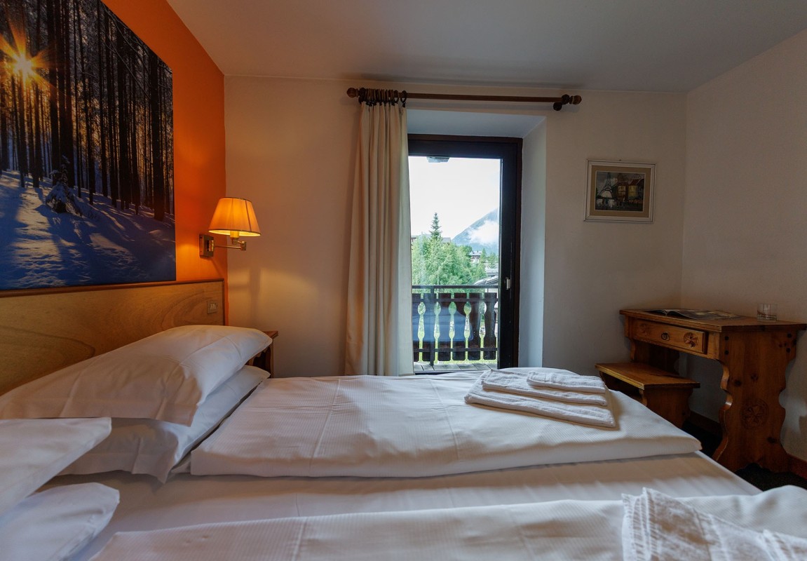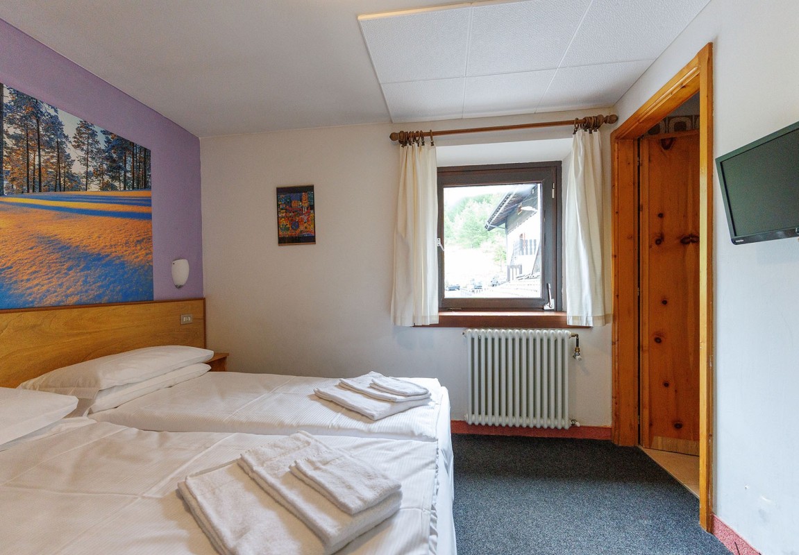 La nostra sistemazione più spaziosa, ideale per famiglie o gruppi di amici. La Camera Quadrupla è composta da due camere comunicanti, una soluzione che garantisce a tutti comfort e privacy. La dotazione include due bagni, due balconi e due TV satellitari. L'arredamento richiama lo stile degli anni '70, ma la praticità della sistemazione e la convenienza del prezzo ne fanno un'opzione eccellente. Spaziosa e pulita, rappresenta il miglior compromesso per gruppi attenti al budget che desiderano soggiornare a Livigno.